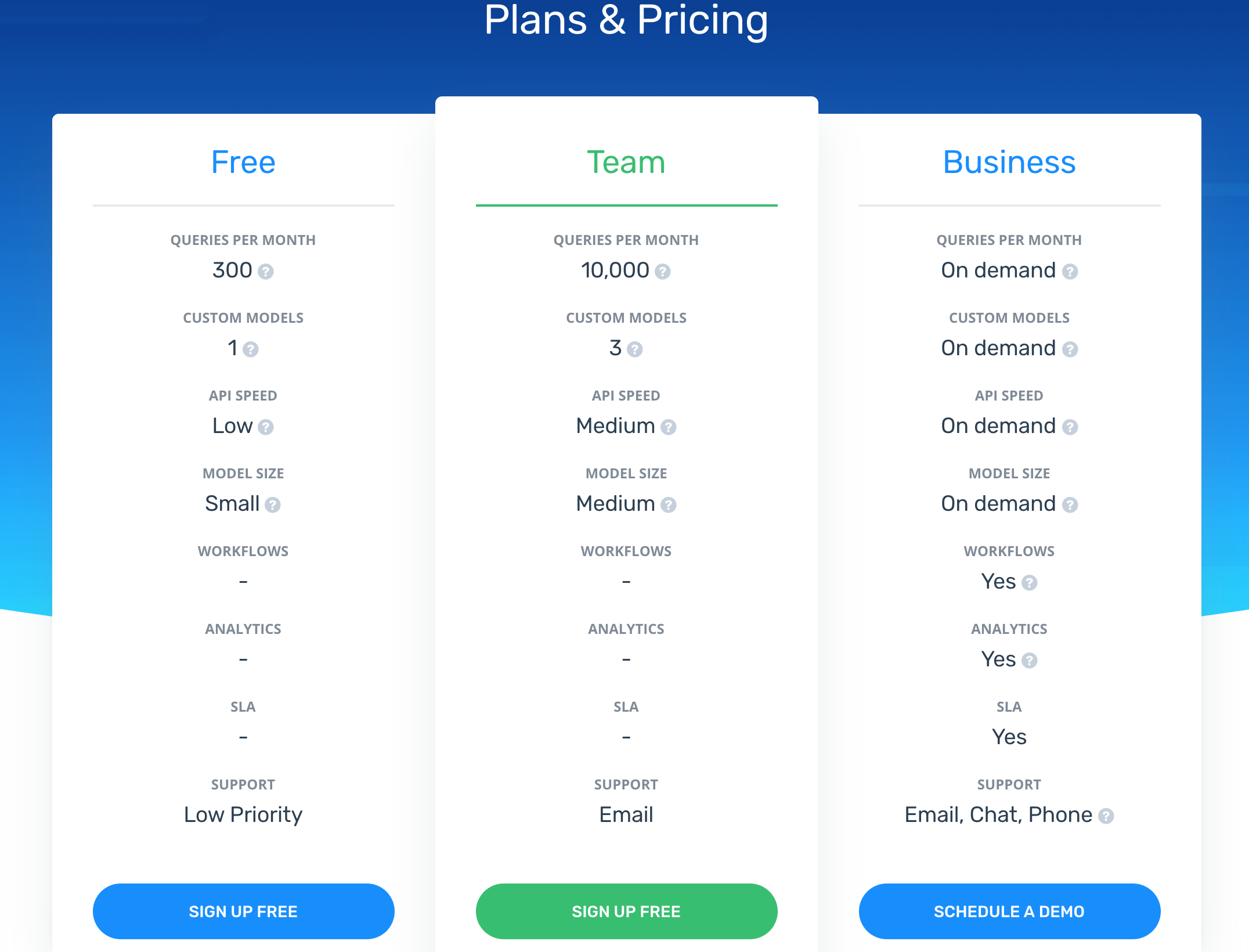 Business: Customized price based on your needs and you’ll get your desired number of queries and custom models. You also get high API speed, large model size, and email, chat, and phone support.